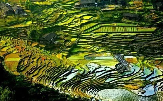 每年的4-5月是梯田注水的季节,注水后的梯田闪现着出银白色的光芒,更凸显梯田婀娜曲折的轮廓。夏天,到处是一片青葱稻浪,好像一条条绿色彩带迎风飘扬。金秋十月,由于海拔高低不同,同处于一座山坡的梯田,黄色由浅变深,形态各异,共同组成了一幅幅精美的图画。
