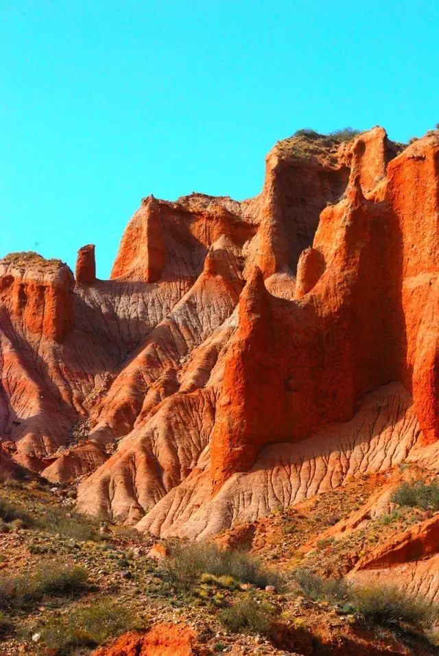 库车大峡谷是中国第二大的峡谷,它红褐色的山体群直插云天,在阳光照射下,犹如一簇簇燃烧的火焰。