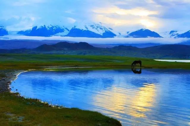 湖畔水草丰美,常有柯尔克孜牧民在此驻牧。遇到晴朗的天气,碧水倒映银峰,湖光山色浑为一体,更使人迷恋。