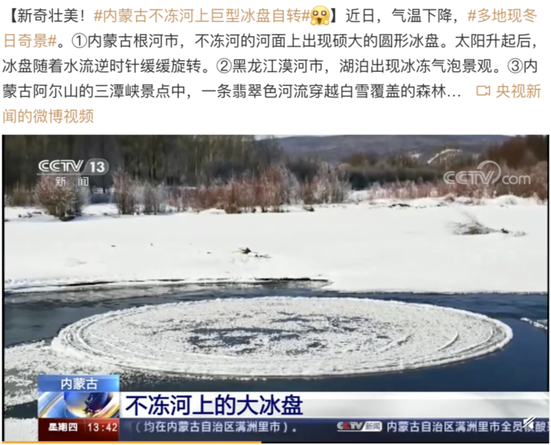 前两天微博上出现了一个热门话题#内蒙古不冻河上巨型冰盘自转#,而这一 罕 见 奇观 就发 生在内蒙古根河市。