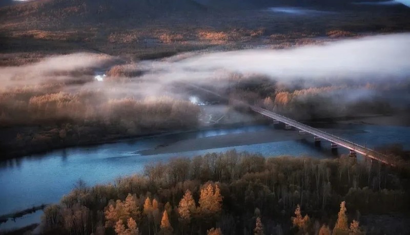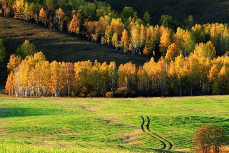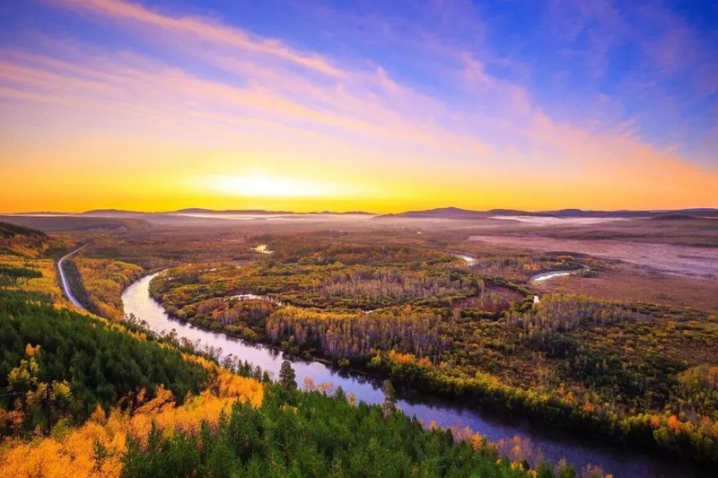 老舍在《林海》中对大兴安岭描写到:“青松作衫,白桦为裙,还穿着绣花鞋。”可能说的就是根河的林区吧。秋天的根河山林被秋色染尽,叠翠流金,像一轴几千里长的巨幅油画绵 延 铺 展,十分壮美。在这样的景色中,人们仿佛在已忘记这片土地被誉为“中国冷极”,只在这金色的火焰中流连忘返。