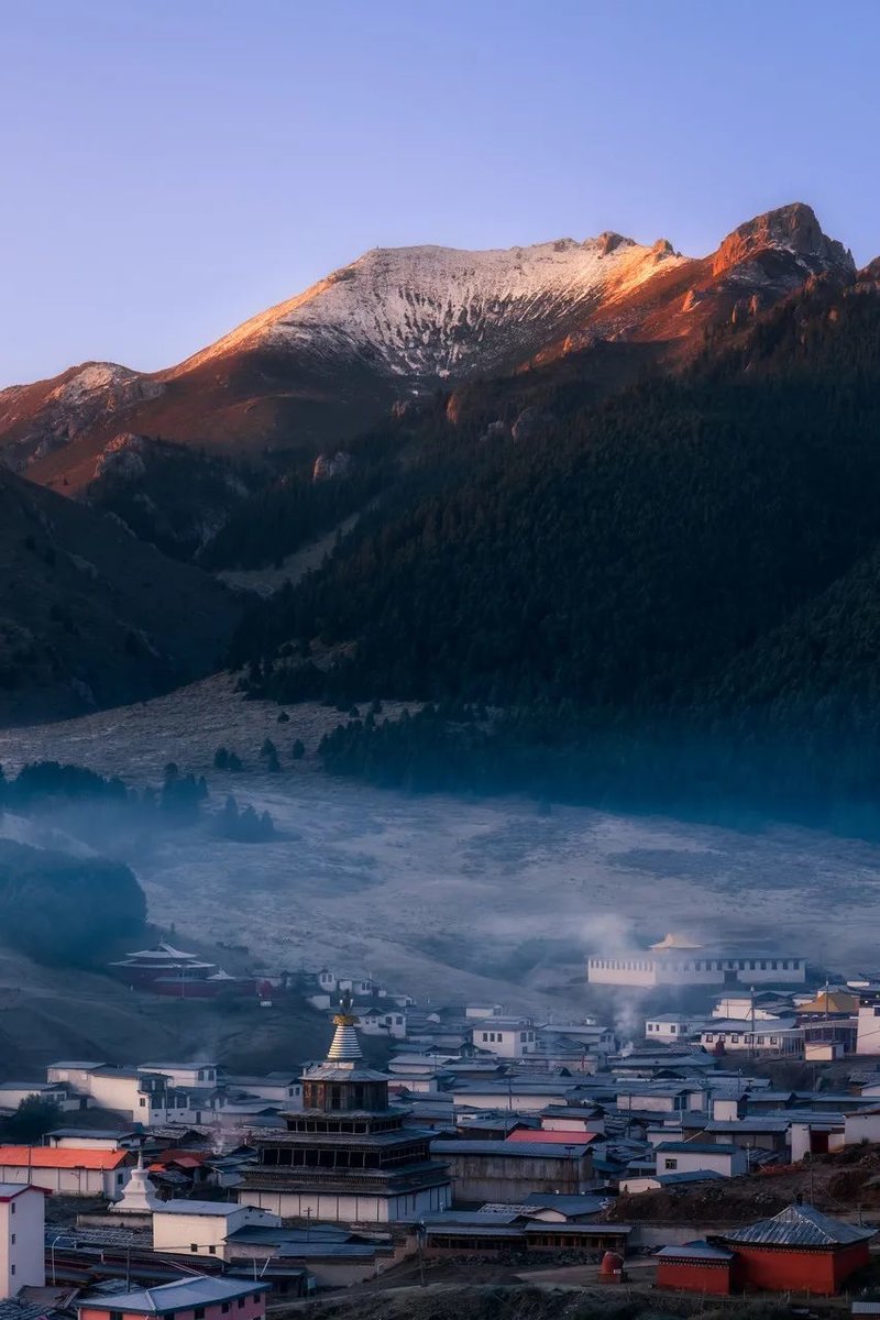 藏房的烟囱袅袅炊烟升起,寺庙苏醒的法号低沉而悠远,格桑花、羊角花烂漫开放,背水女孩胸前的铃铛声声清脆。