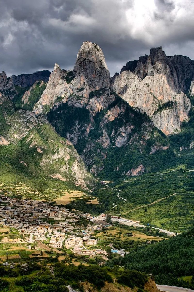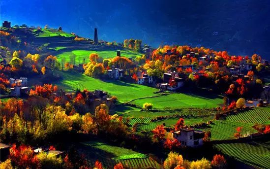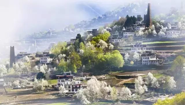 当你沿着缓缓的盘山路,一直往上走,到达最高处的观景台,俯身看着那些红白小间的藏式小碉楼掩映在青山绿树间,宛如进入了一个童话般的世界。