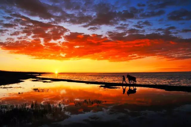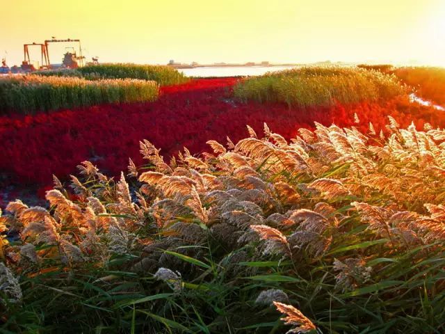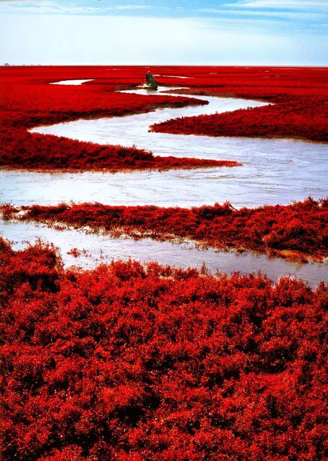 一棵棵纤柔的碱蓬草织就了红海滩,它每年4月长出地面,初为嫩红,渐次转深,9月由红变紫。