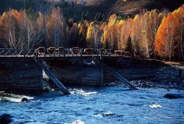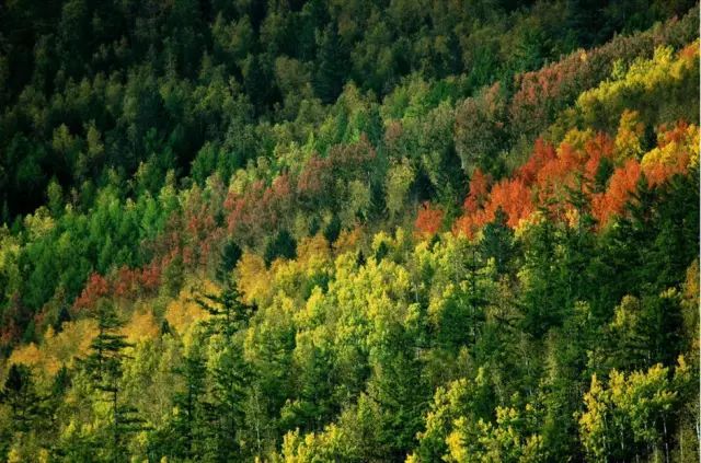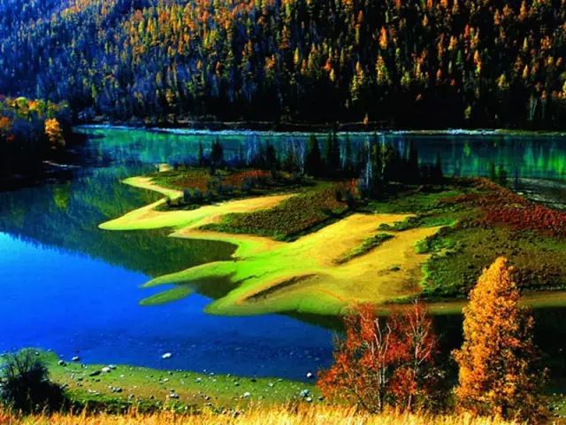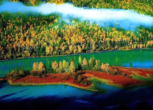秋天的喀纳斯,色彩浓烈得难以想象。湛蓝的苍穹下,翡翠石般的喀纳斯湖旁,林带的颜色层次分明,红似火,灿如金,青若葱,层林尽染,五彩斑斓。