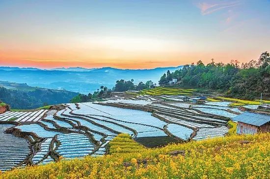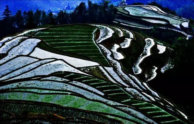 这里有句民谣:“上堡,上堡,高山顶上水淼淼。” 顺山势而蜿蜓起伏的田埂犹如绿色湖面上的阵阵涟漪,蓄满了水的梯田,流光溢彩。
