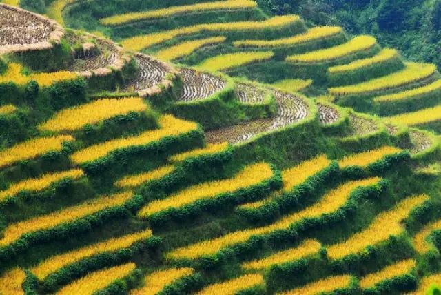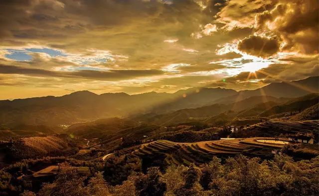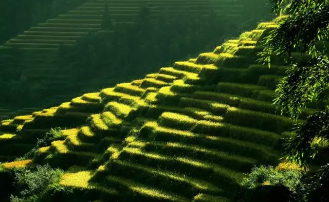 站在山上从上帝的角度俯瞰,前面脚下的山头布满了层层叠叠的梯田,一层层一排排,在眼前铺天盖地,精致而又恢宏。