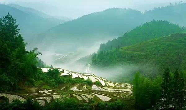 上堡梯田被上海大世界基尼斯评为“最大的客家梯田”,依山势开建,连绵数百亩,又有零星村落点缀其间,是国内三大梯田奇观之一。