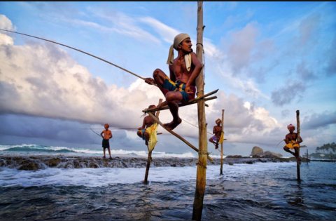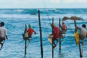 斯里兰卡南部海岸,有一种非常独特的钓鱼方式——高跷海钓 。在波涛汹涌的海边立起一根根深札入海底的木桩,在木桩的上面横向固定一根木杆,便制成一个简单的空中“凳子”。渔民们涉水到达浸泡在海水中的木桩,爬上去,或坐或站在简陋的“凳子”上,抛出鱼线,静待鱼儿上钩。远远看去,好似一群脚踩高跷站立海水中的垂钓者。