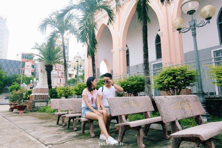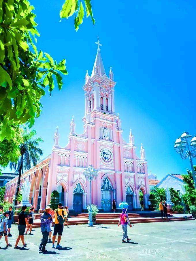 其后我们回返进入岘港市区参观岘港大教堂。岘港大教堂是是越南中部最大的西方教堂。是法国殖民时期当地兴建的唯一一座天主教堂。教堂塔尖上有风信鸡,鸡教堂的称呼由此而来。如糖果般的粉红色建筑几乎成为岘港的标志,中世纪风格的彩绘玻璃窗与粉红色的外观相映成趣,鲜明可爱。蓝天衬托粉红色的尖塔教堂,以此为背景拍照是极美的。