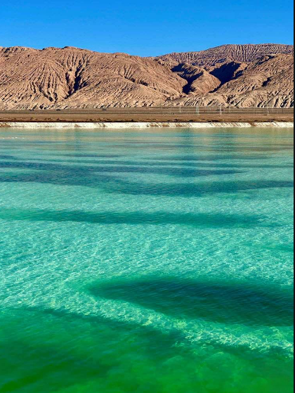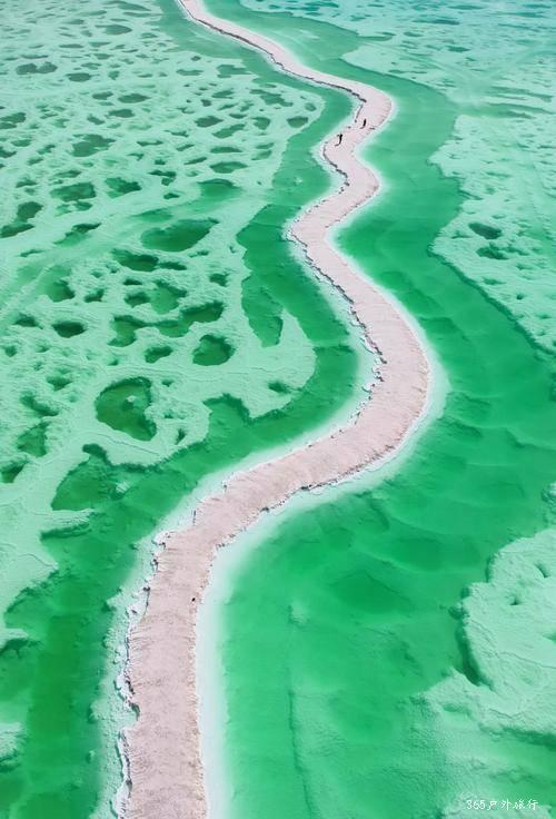 离开冷湖,茫崖翡翠湖会颠覆你对“湖”的想象。这是一片由盐湖组成的“翡翠海洋”,不同区域的湖水因盐度不同,呈现出深浅不一的绿——浅绿像薄荷糖,深绿像翡翠,阳光洒在湖面,波光粼粼如碎钻闪烁。走在盐滩上,脚下的盐结晶像白色的雪花,偶尔能看见盐洞,透过洞口能看见湖水的翠绿,仿佛凝视着一块巨大的天然翡翠。