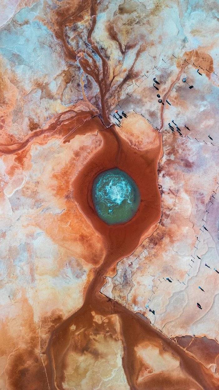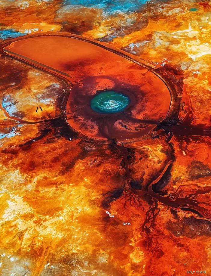 艾肯泉是茫崖的“恶魔之眼”,从空中俯瞰,泉眼周围的硫磺矿物质形成了红、黄、橙相间的环状纹理,像一只巨大的眼睛凝视着天空,泉水汩汩涌出,带着铁锈色的泡沫,空气中弥漫着淡淡的硫磺味,既神秘又壮观,仿佛是大地的脉搏在跳动。