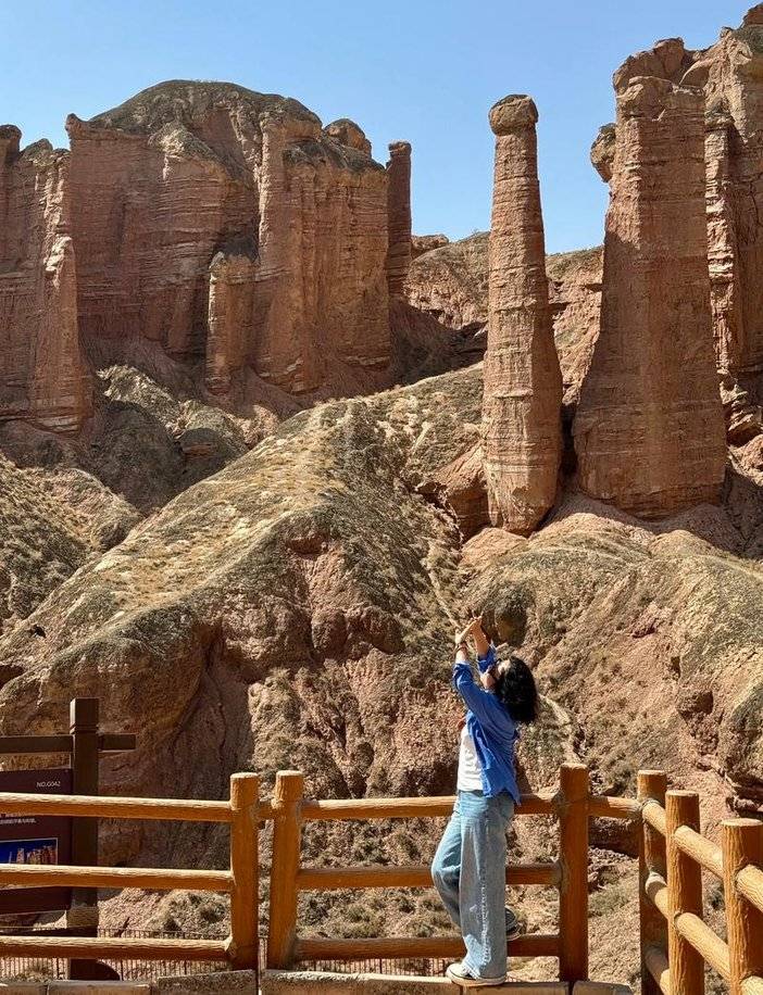 离开张掖市区,冰沟丹霞是另一种硬核的美。这里没有张掖丹霞的七彩绚烂,却有更磅礴的“地质雕塑”——“卢浮魅影”像一座天然的宫殿,岩壁褶皱如建筑浮雕;“神驼迎宾”的轮廓在风沙中愈发清晰,仿佛正驮着千年的故事等待旅人。相比七彩丹霞的柔美,冰沟丹霞更像大地的筋骨,裸露而有力量。