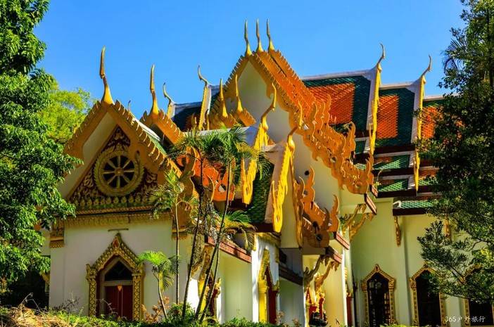泰佛寺仿照泰国云石寺,极富泰国特色,重檐多面式屋顶装鱼鳞瓦、封檐板装向上的黄色图形,柱头翘角是龙凤呈祥之意。后院还有片竹林,幽静祥和,人也不多,很适合休闲发呆。