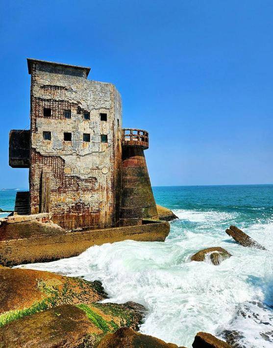 是一处独特的海边,以其沧桑的历史感和极致的出片效果吸引了众多游客。独特的历史沧桑感:这座被称为"海上古堡"的建筑。古堡三面环海的地理位置,加上粗粝的混凝土质感与海浪的碰撞,海浪拍打礁石卷起千堆雪,能拍出极具氛围感的照片。