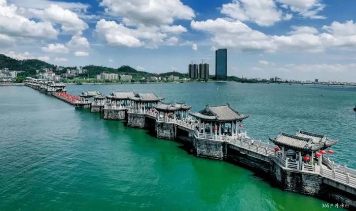 整座横跨韩江,连接东西两岸,集梁桥、拱桥和浮桥于一体。桥面古色古香,桥墩建有牌坊和楼阁,24楼阁24个样式,中间有18馊古船相连,供行人通过。