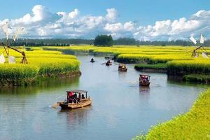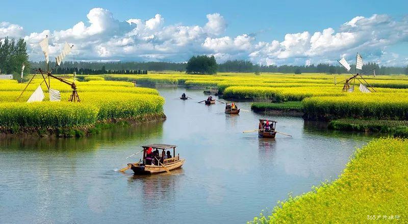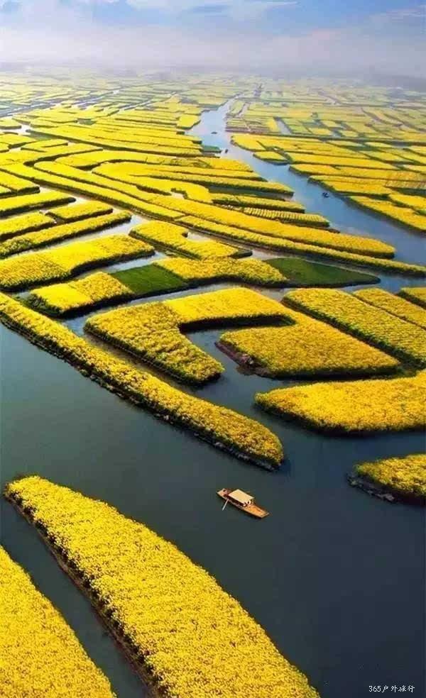 千岛垛田油菜花海:每当清明前后,油菜花开,蓝天、碧水、“金岛”织就了“河有万湾多碧水,田无一垛不黄花”的奇丽画。竹径春光心无羁,垛田青青翠欲滴。彩蝶飞入黄华里,或有幽香起涟漪。从高处看垛田油菜花,黄色的花一块块飘在水里,象是养在水里的盆景。从上望下看,大地上一块块黄色,从脚下向天边伸去,热烈、奔放、火辣辣的。小河小沟把黄色切割成各种几何形状,特别养眼,真正是心旷神怡。