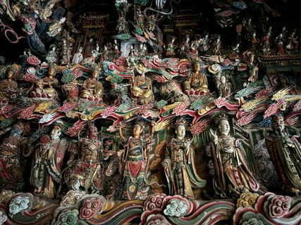 观音堂500尊彩塑像在梁架间层层叠叠,