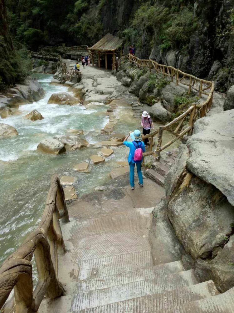 我,海洋,良子,小勇选择徒步下山,女儿随其余的队友下天梯乘船到谷底。第二天全程16.5公里。