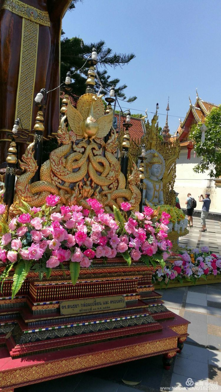 素贴寺的精美程度无与伦比,精致的摆件,金碧辉煌,在蓝天白云映衬下更加壮丽华美。山上的空气很清新,在阳光的照耀下显得格外的耀眼。素贴寺也叫双龙寺,泰国著名的佛教避暑胜地,充满传奇色彩。传说有位锡兰高僧带了几颗佛舍利到泰国,高僧们怕被人抢走,便决定将舍利放在白象上,由白象选择一处可以建寺供奉舍利的福地,白象随意游荡,便在双龙寺的现址趴下,人们就建了舍利塔,又由于山路两旁有两只金龙守护,所以便叫做“双龙寺”。 双龙寺有三件宝物,1)寺内供奉释迦摩尼佛的舍利子,2)九世皇所赠予的水晶莲花,四周用各界捐赠的宝石镶缀而成,置于塔的顶端;3)正殿的释迦摩尼佛像;寺内有一鸡的照片,系和尚化缘得来未食之,大概感恩,每当游客裙长不及膝即啄之。