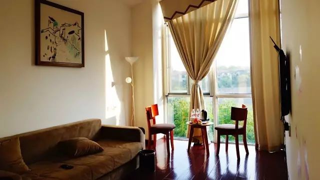 我住的悦湖,有客厅卧室和卫生间,很舒适。落地窗很喜欢。唯一遗憾是这个季节湖水有点干涸,少了许多灵气。