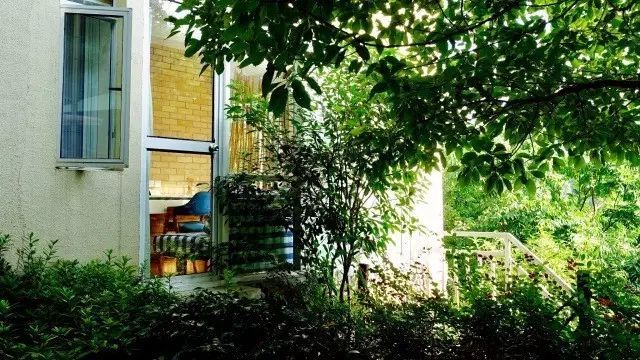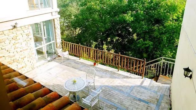 沿着几乎被草木掩盖的小路,爬上一个楼梯,竟是一处有桌椅的小院子,两端房间内的住客,推开后门便可坐下一起喝茶聊天。