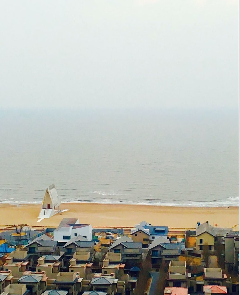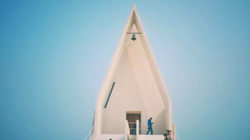 图书馆旁有一座纯白的阿那亚礼堂,没有多余的色彩和纹饰的三角建筑如同一艘船,安静地漂浮在这沙与海之间,为困于都市纷扰的游人提供精神家园。