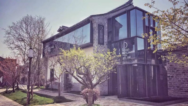 沿着小巷子走过金陵美术馆,可以看到一座现代玻璃幕墙镶嵌下的传统建筑,蓝天白云倒映在建筑之上,颇有大隐隐于市的意味,隐南·门东酒店就藏身于此。