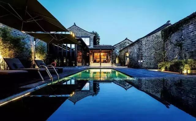 酒店的布局设计在体现“隐”的同时,亦张弛有度。前台一旁是休息区,改造自老院子中的天井、灰砖墙,所有的构件与色调都循着历史曾有的温度。一转身,便可看到一方蔚蓝的泳池映入眼帘。设计师竟将水系引入了院落之中,在青砖小瓦马头墙环绕之下做了一个长14米、宽4米的温水泳池。