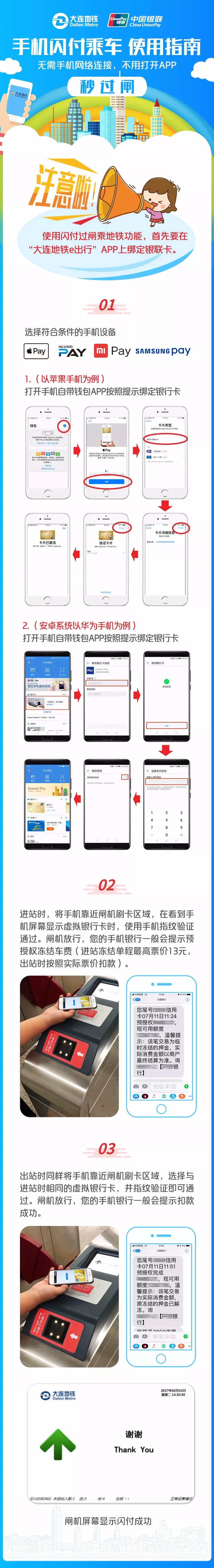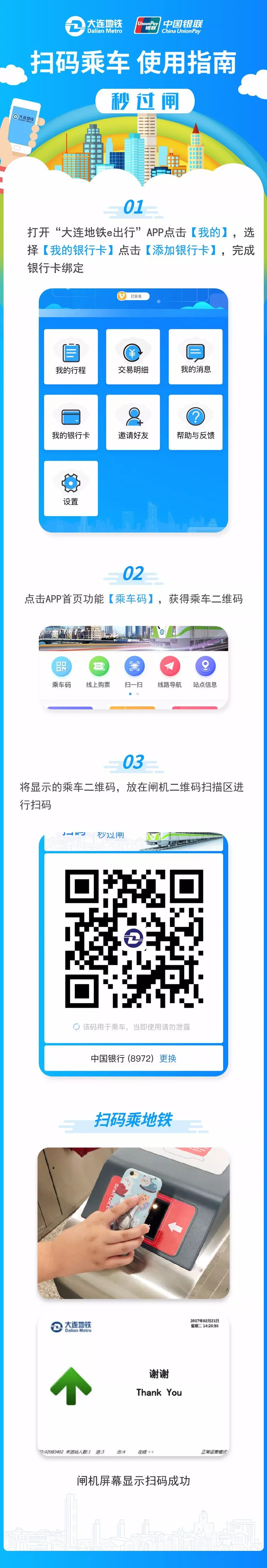 乘客只需下载“大连地铁e出行”APP并绑定银联标准卡,就可以使用扫码支付、手机闪付或银联IC卡闪付等支付方式,实现一“挥”即付秒过闸的移动支付服务体验。