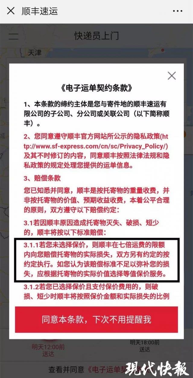 快递公司的保价条款提醒。 图片由法院提供
