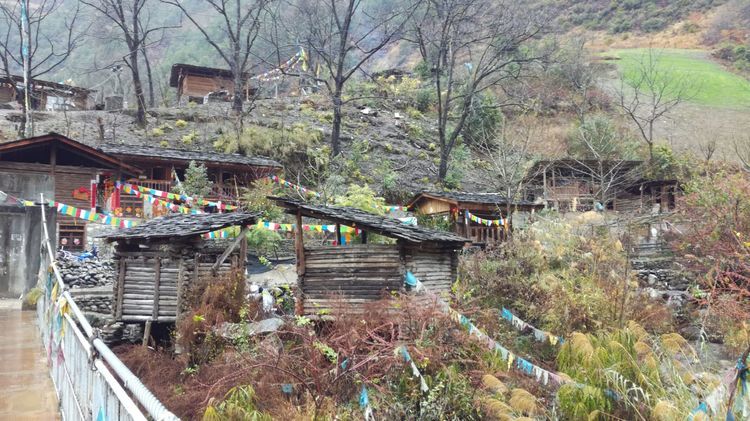 雾里村有怒族和藏族,到处是经幡。有许多这样的小木房子,下面是水车,这房子叫水磨坊。房子下面是山涧溪流水势挺大的