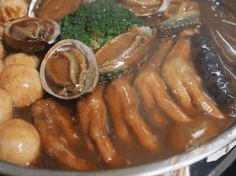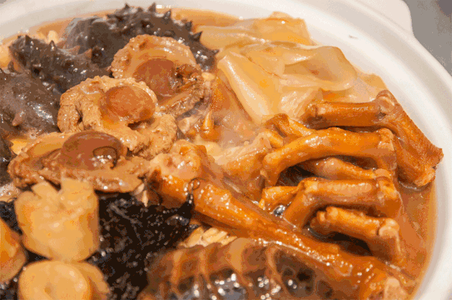 把裹着汤汁的食材夹出,先吹两口放凉一会,然后一口接一口。鲍鱼弹牙、鹅掌黏嘴、蚝豉充斥了大海的味道、猪肉焖煮的软烂入味、还有吸满精华的萝卜、白菜和腐竹,鲜到叫人白日飞升。