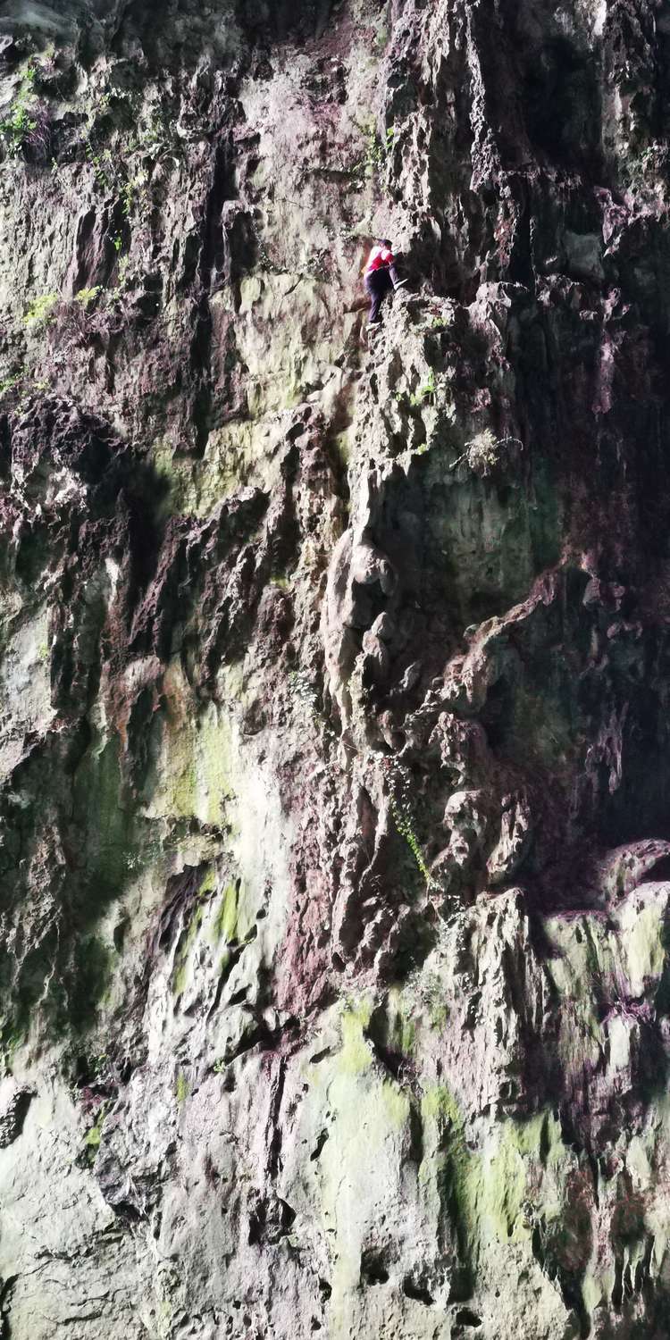 蜘蛛人下来的时候已经是满脸的汗,这绝对是胆量与体力的双重要求,这可是几近垂直的崖壁,好在岩壁不是光滑的,有很多凹凸处可以借力,手指和上臂绝对的超乎常人。