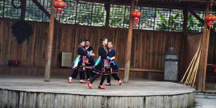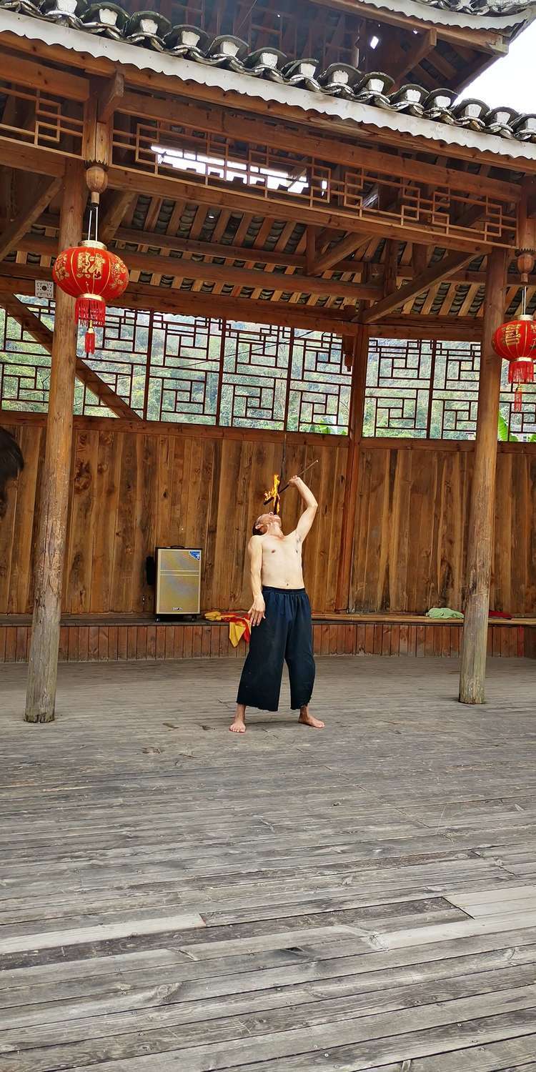 苗族迎客敬酒舞,跳花场里一共也没有几位参观者,于是逐一的敬,敬到我们这里我也躲不开,于是接过来,一口闷,晕