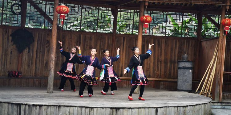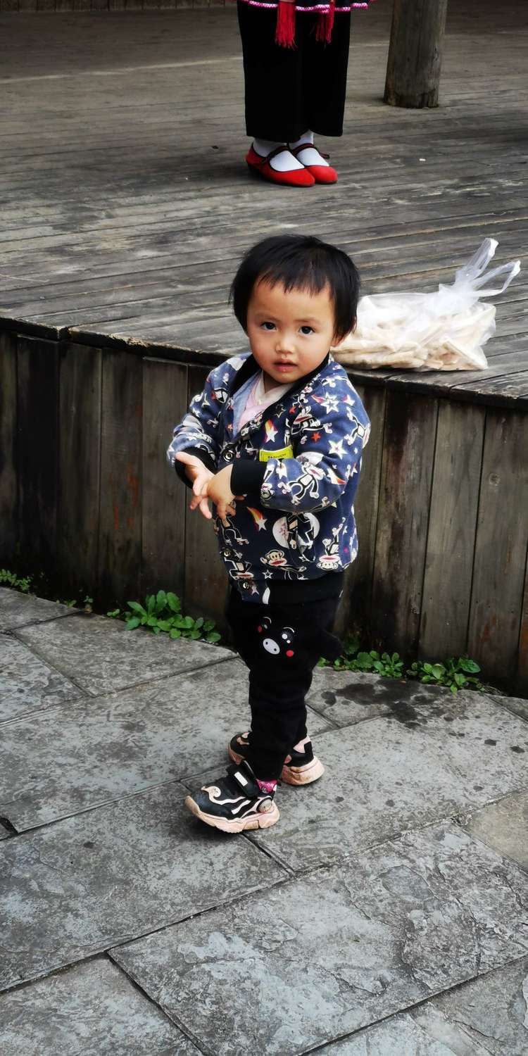苗寨里的大眼睛宝宝,妈妈在台上表演,她在台下跟着一起唱唱跳跳,可爱极了。