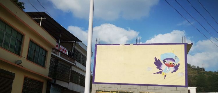 进入紫云县,公路两旁的楼房两侧都是这样的图案,一侧凤凰,一侧紫燕头戴苗族帽子,紫燕两侧有紫色的云,取意紫气东升,云蒸霞蔚之意。