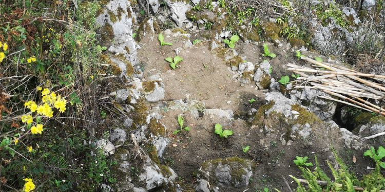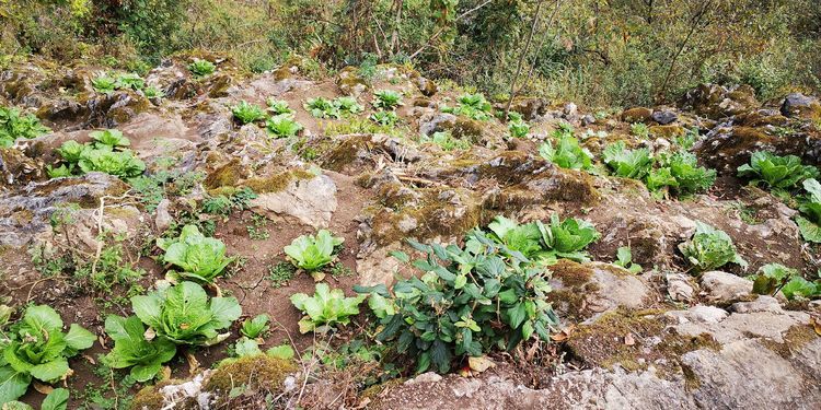 居民惜地,充分利用洞穴附近山坳的土地,三五棵玉米,七八棵小菜,一丛小葱
