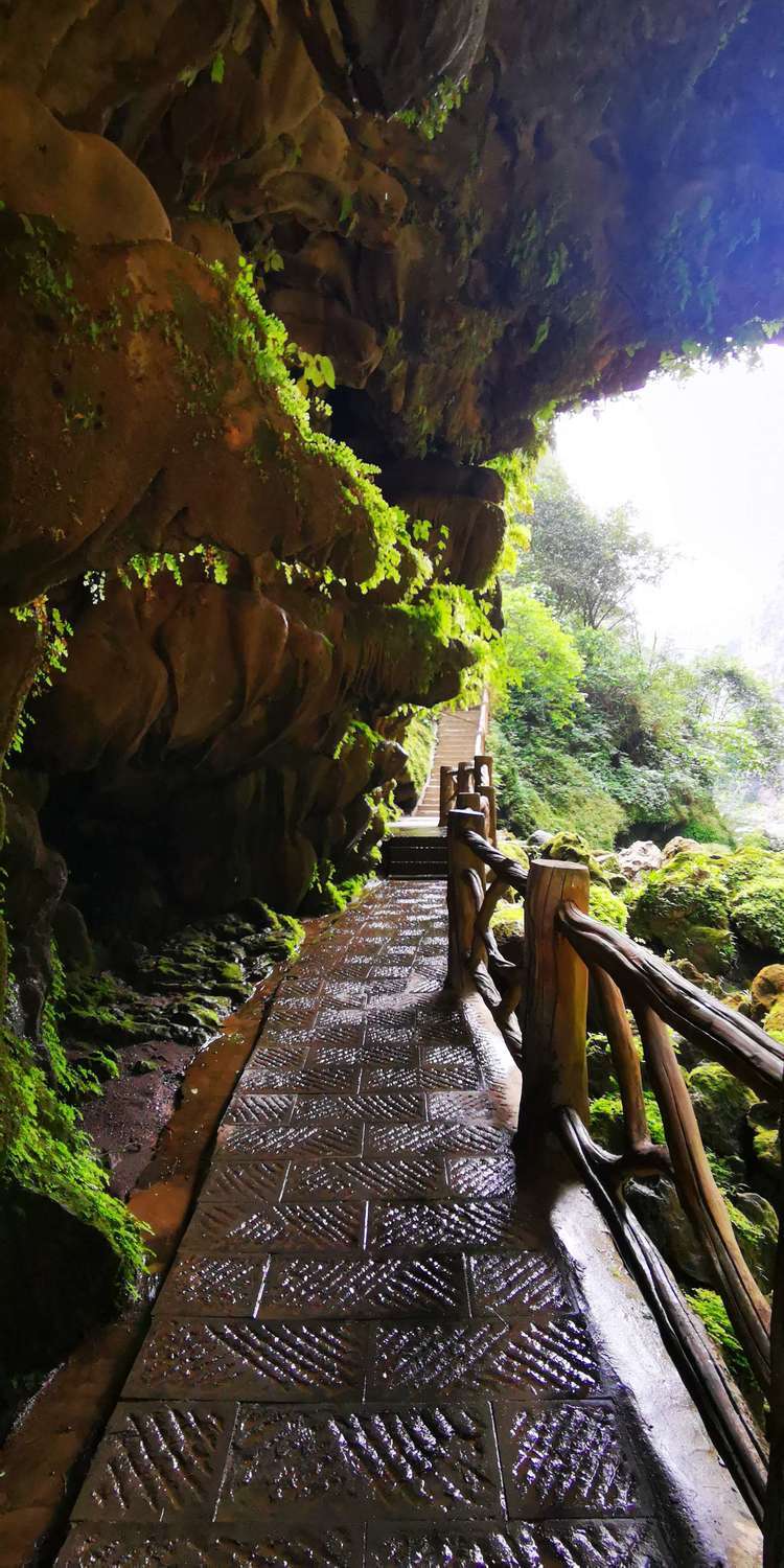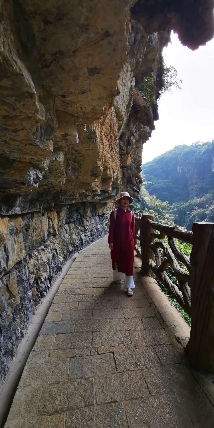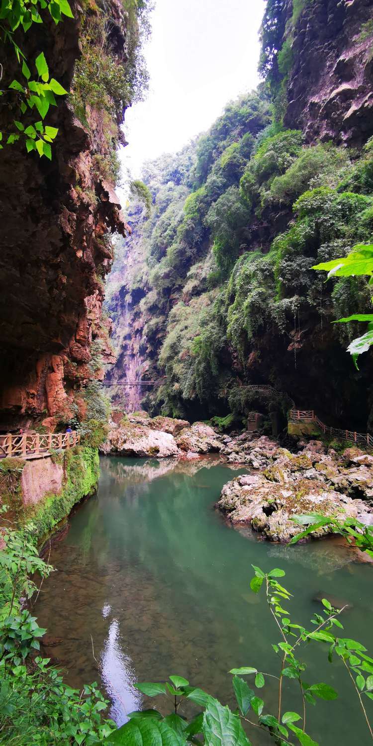 峡谷深幽,栈道攀崖而行,曲曲折折, 引人入胜,沿道而游,如进画中。