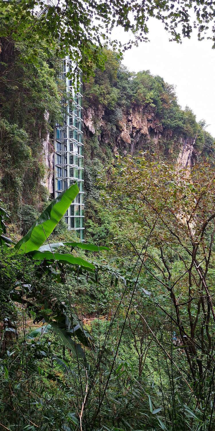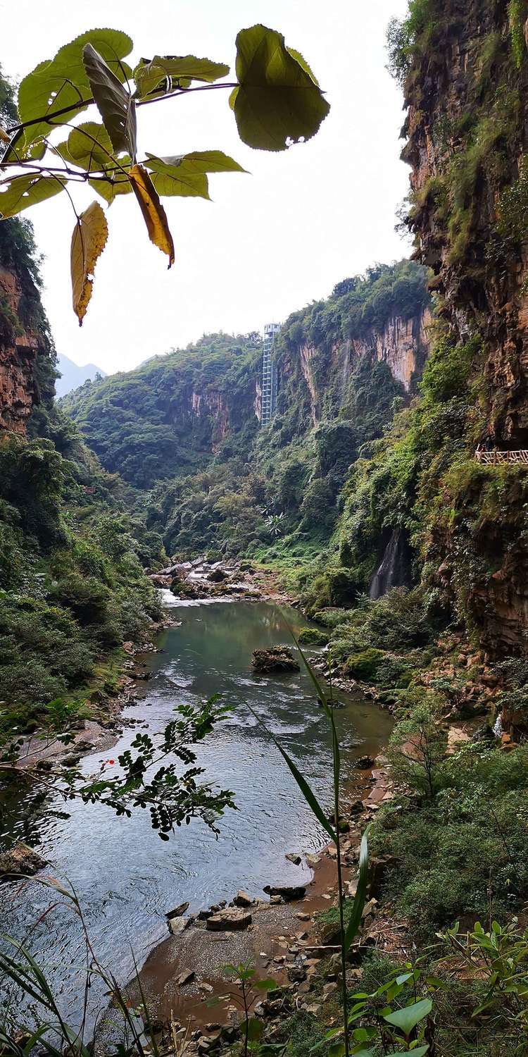 景区现在有升降观光电梯,据说这个观光电梯是2007年才建的,电梯下到峡谷底部也就一分多钟时间,到了峡谷的底部,可以沿峡谷两边的步行道行走观光。电梯旁边有一条陡峭的石阶路,走下来也并不很费时。