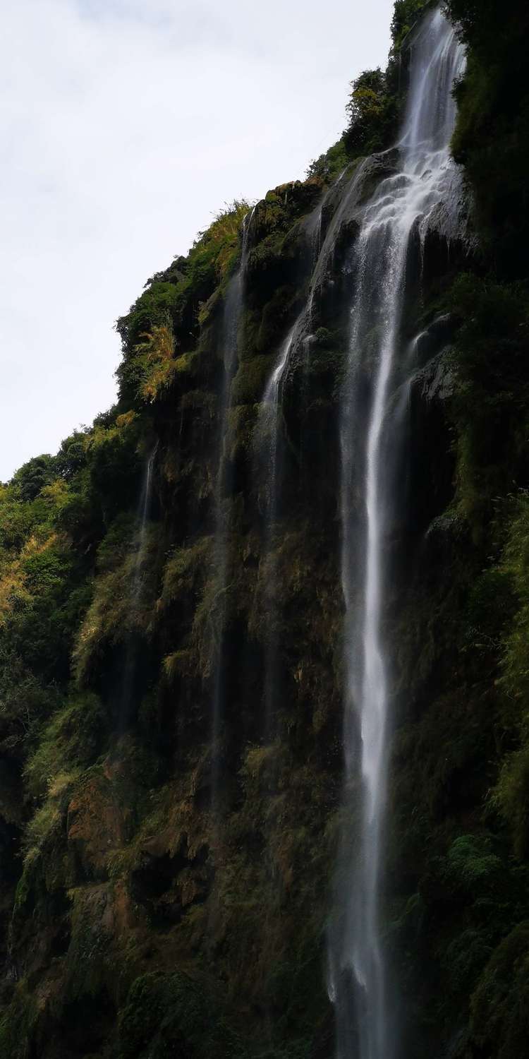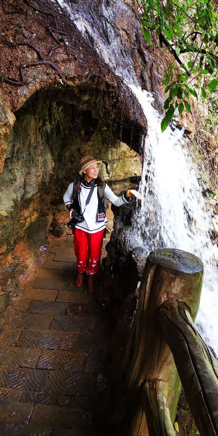 沿着高低曲折的栈道探秘寻幽,忽而如入水帘洞,忽而又柳暗花明,细线似的水像透明的珠子,随风而动