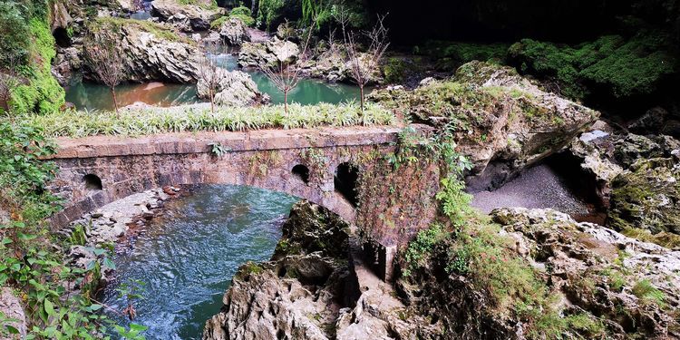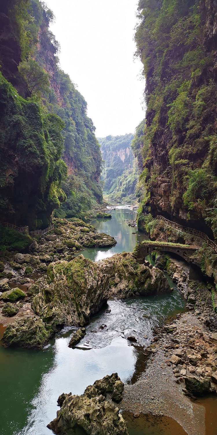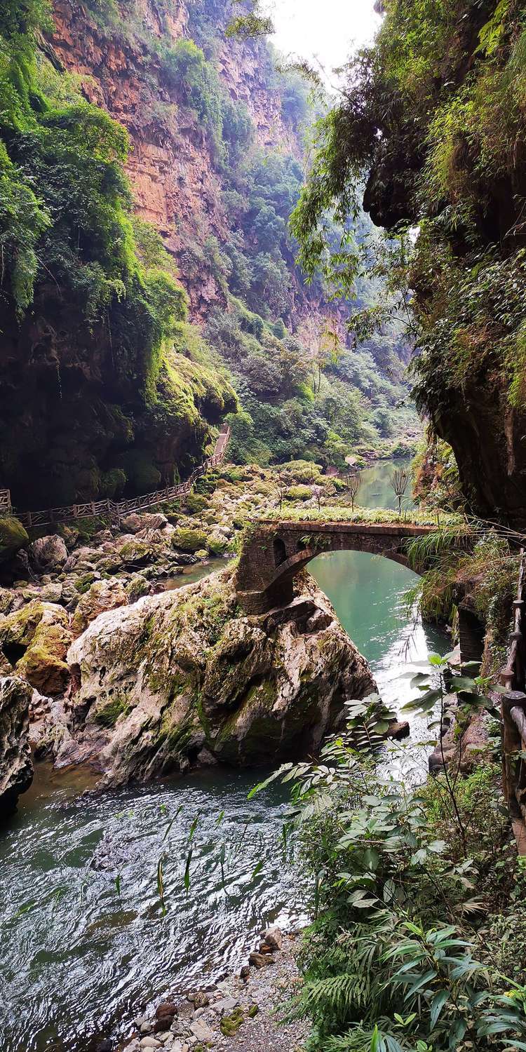 回首看,一座残桥立在水中,给这幽深的峡谷,增添了几分神秘。