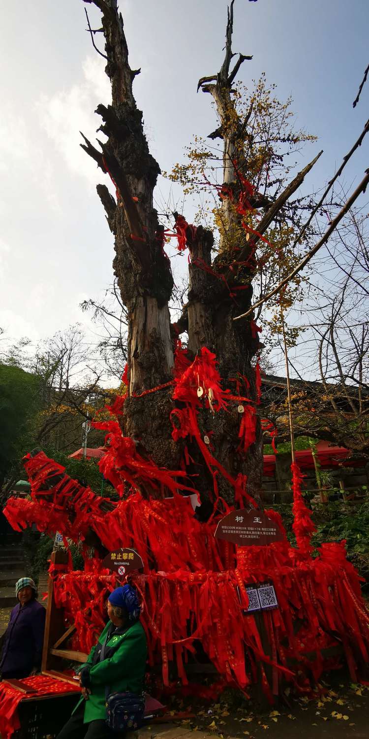 村里的树王被红布条包裹着祈福,树下村民卖着烤白果,闻着有种淡淡的药香,吃起来稍有些Q,倒也不敢多吃