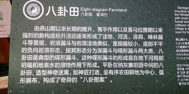 这些纳灰漏斗群为宽而浅的碟型漏斗。农田耕地以漏斗为中心,弧型展布,构成了奇异的"八卦"图案。据说踩一踩八卦田,升官又发财。还有一条纳灰河在田中穿过,却又消失在田野中。当然,我们只能远远的在半山遥望,没有机会去踩一踩的