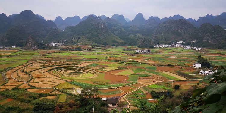 万峰林八卦田是一片天然形成的八卦田,平卧在纳灰寨农田中央,其造型神奇迷离,如神匠打造,层叠有序。八卦田中有三个天然地漏,深不见底,被称为地眼--大地的眼睛。