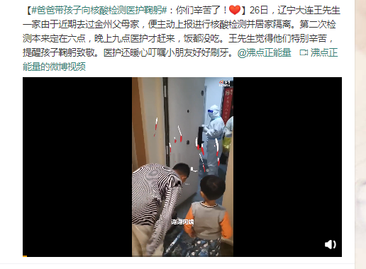 王先生先是主动关心对方是否吃饭,检测完毕后,又带着孩子,一起向检测人员鞠躬致敬。
