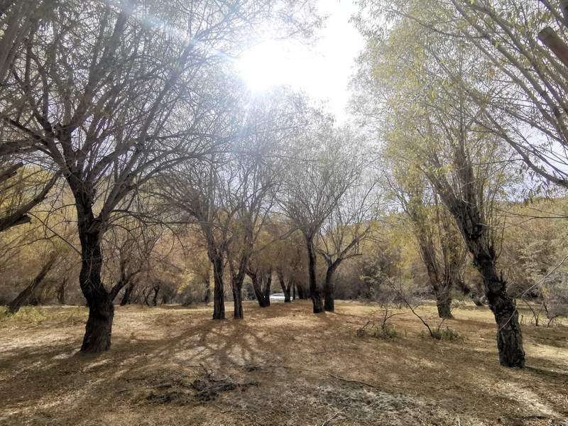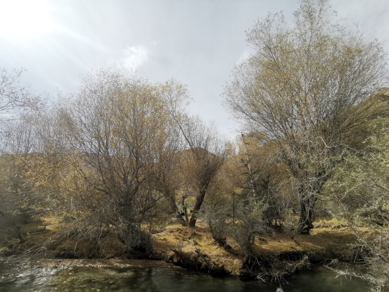 广域的塔合曼湿地内的河水清冽,泛着梦幻的湖蓝色,而草场则幻化为满目的金黄,远方是白云飘舞缭绕的慕斯塔格雪峰,天地间尽管只保留了白黄蓝三种色调。却让画面变得更加简洁而静谧。极目远眺,层次分明地朝着天际悠长的延伸。宛如那首秋日私语的钢琴曲般悠扬而静美愉悦着身心……