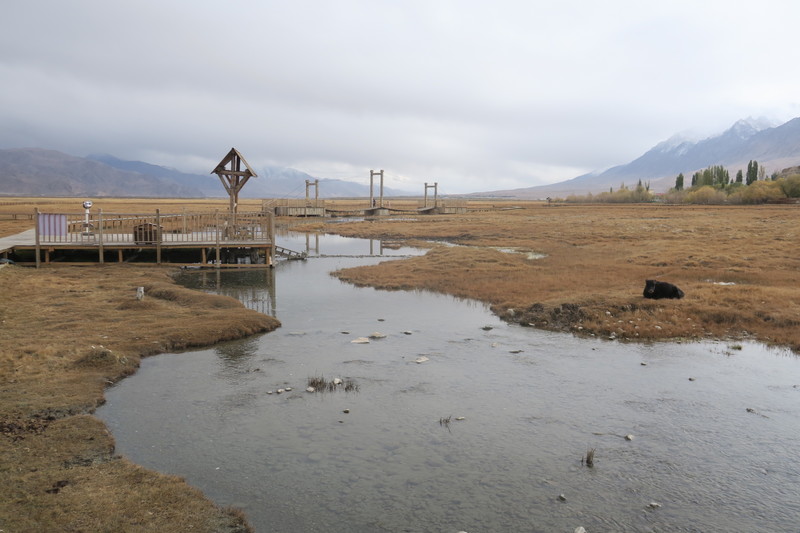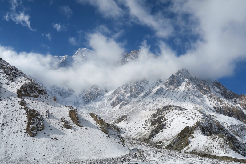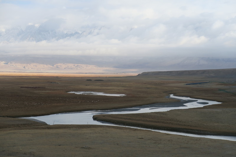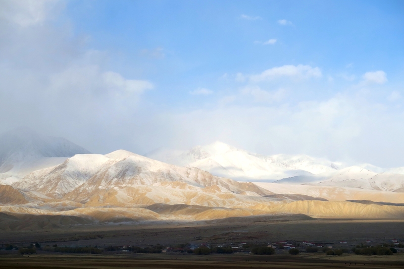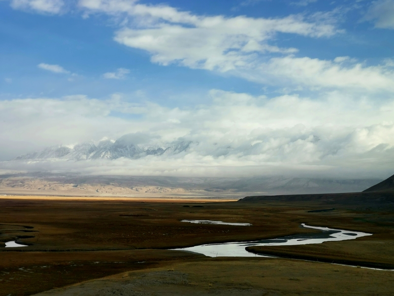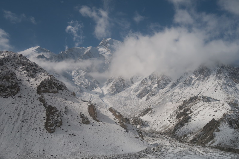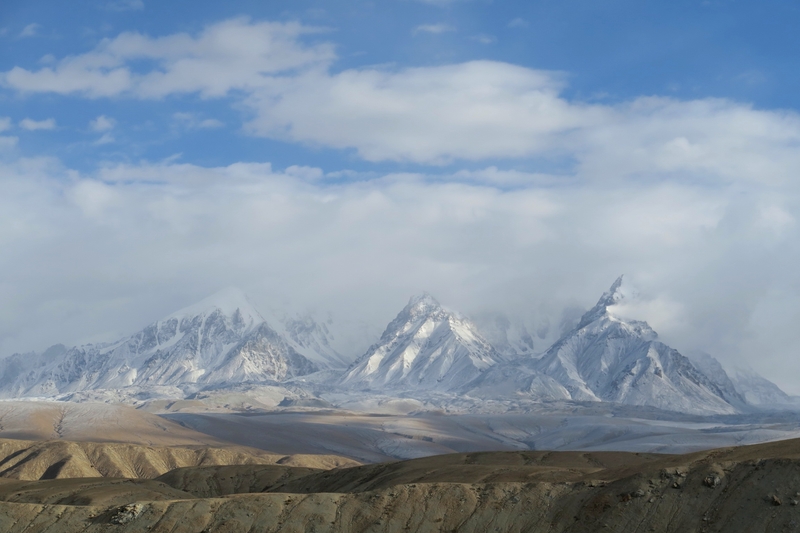 这个画面我们称之为时光隧道,废弃的公路,高大密接的柳树,天然形成一条浪漫的时光长廊。漫天飞雪,我们行走在白色得纯净世界里,帕米尔高原,总是会送给我意外的礼物。慕斯塔格保留着神秘,那是她的冰川之父尊严。公格尔峰冲破阴云的遮挡,高高在上向我们问好。