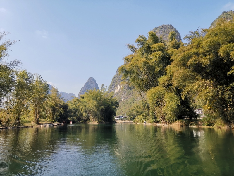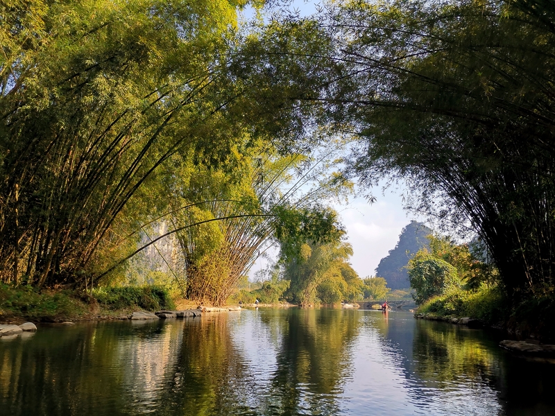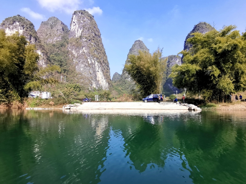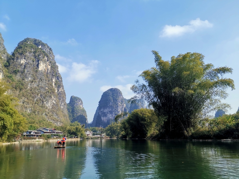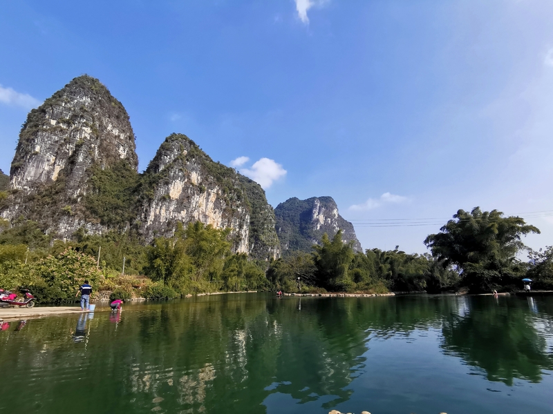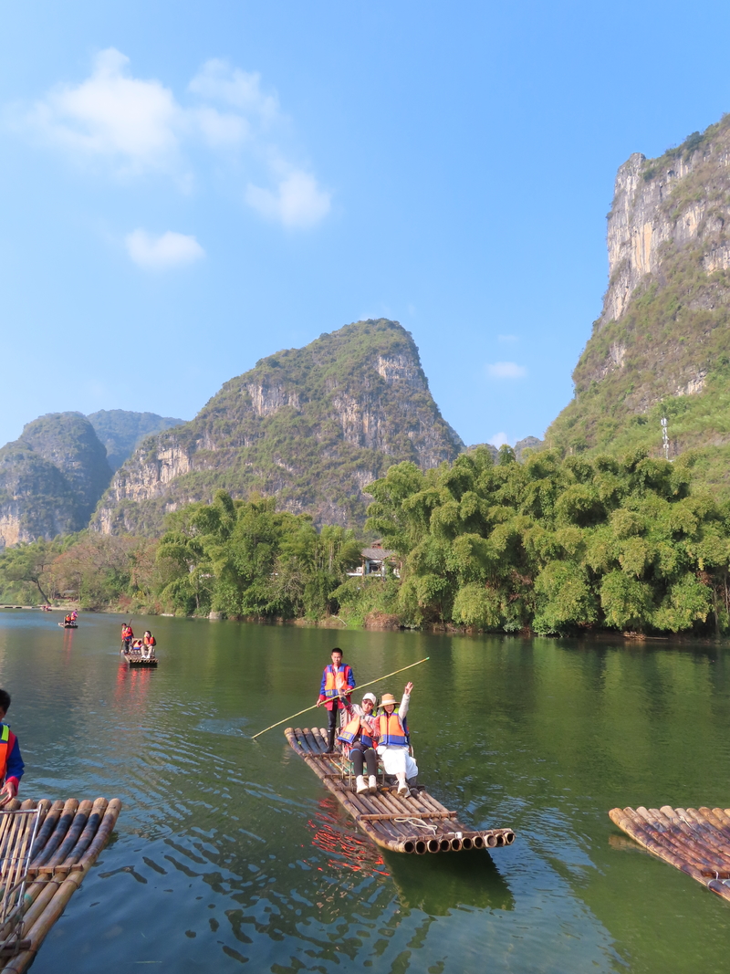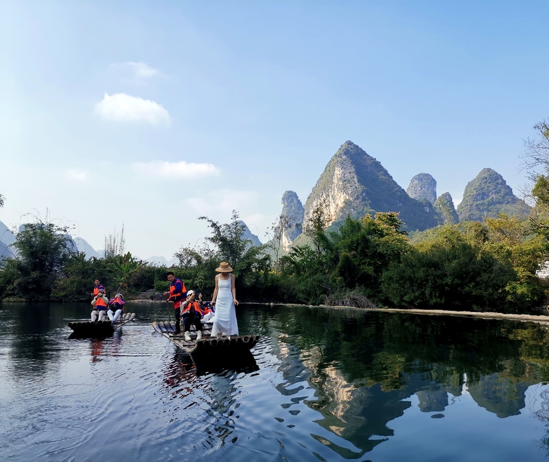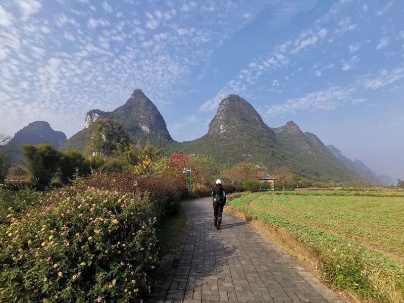 石头铺就的河边小径上骑行兜风,看葱绿的油菜苗精神十足卯足劲生长期待着二月花开奉献金色盛宴,遇龙河两岸山峦百态,终年碧绿的凤尾竹,随风摇曳,婀娜多姿。峰峦叠嶂,蓝天白云,开朗而明快,将阳朔风光表现得淋漓尽致。