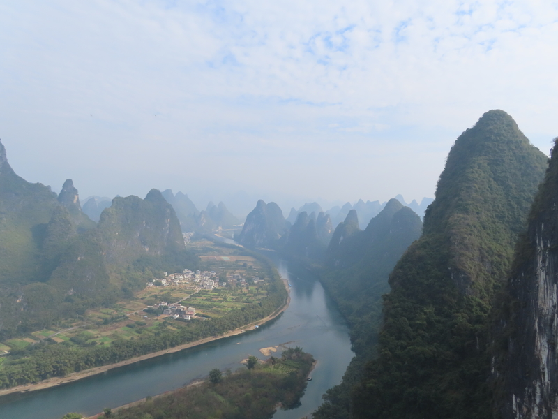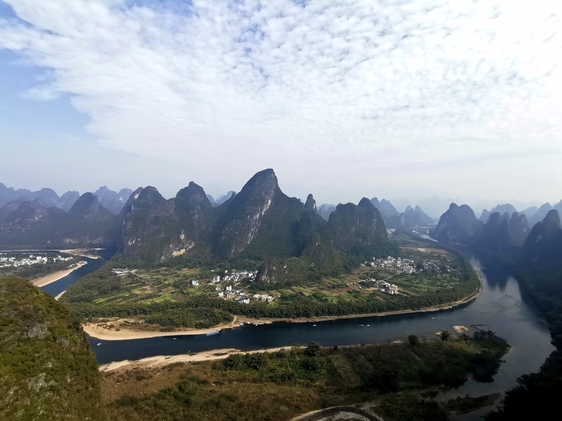 旧村是个好地方。下午我们阳朔行的最后一个目的地相公山也是个好地方。登上相公山举目远眺,无数群峰错落,清澈的漓江蜿蜒流淌在群山怀抱中,在阳朔山水绵延中,独有这一处惊天回转,漓江在此完美的诠释了“钟灵毓秀”。